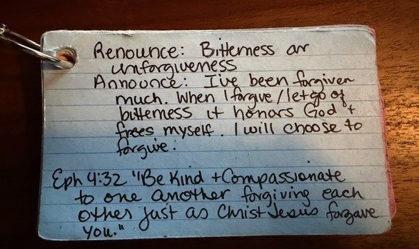 A practice that has helped me greatly in renouncing Satan’s lies and announcing God’s truth is making notecards. I hole punch the upper left corner and color code them based on subject matter. I attach them with a ring.